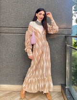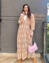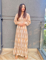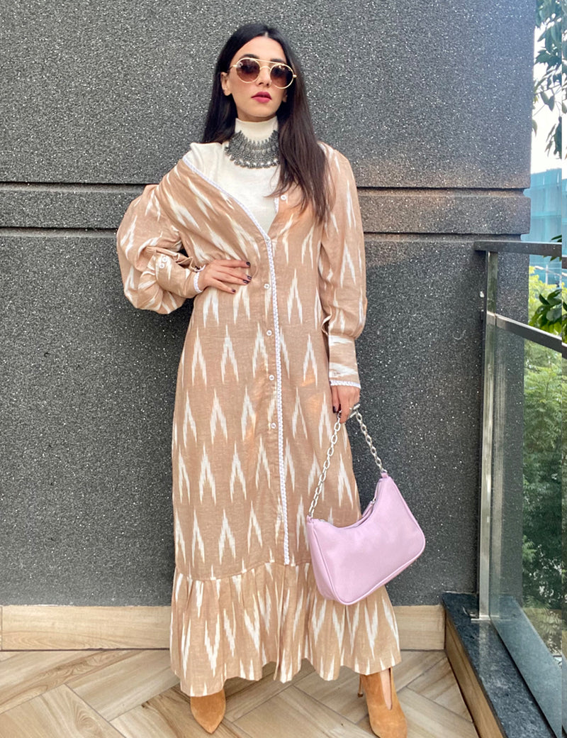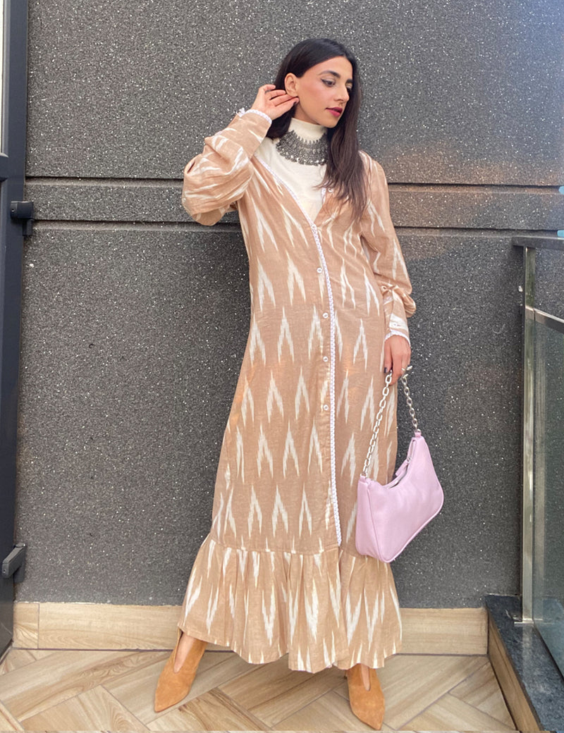 Meet your new go-to dress: the Beige Ikat Maxi Dress that blends heritage print with modern design. With puff sleeves, delicate lace inserts, and a tiered frill hem, this dress is equal parts effortless and elegant. Its button-down front and relaxed silhouette make it the perfect pick for brunch, daytime outings, or even work-to-weekend styling.