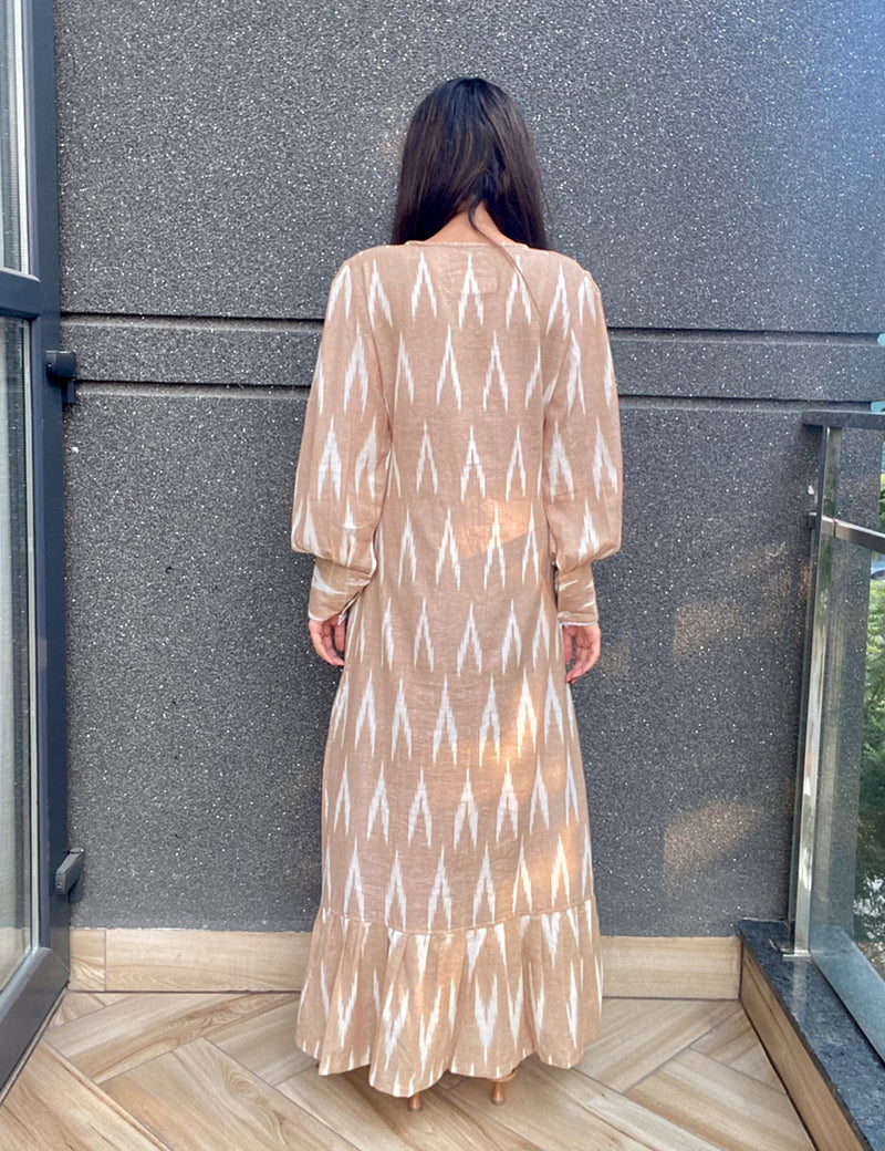 Beige Ikat Maxi Dress – Cotton Tiered Button Front Dress