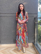 Multicolour Abstract Print Maxi Dress – Long Sleeve Chiffon Dress