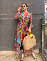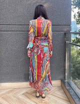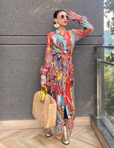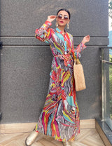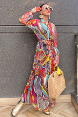 Turn heads in the Abstract Print Chiffon Maxi Dress, a vibrant and flowy piece designed for days when you want to stand out effortlessly. With its bold all-over print, tie waist, and long sleeves, this maxi blends comfort and drama — perfect for brunches, vacations, or evenings out.