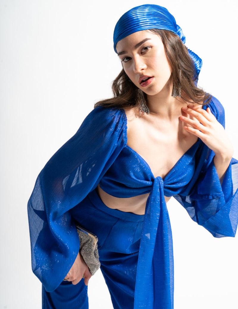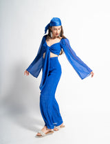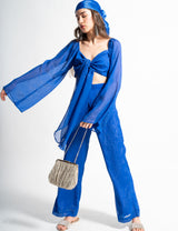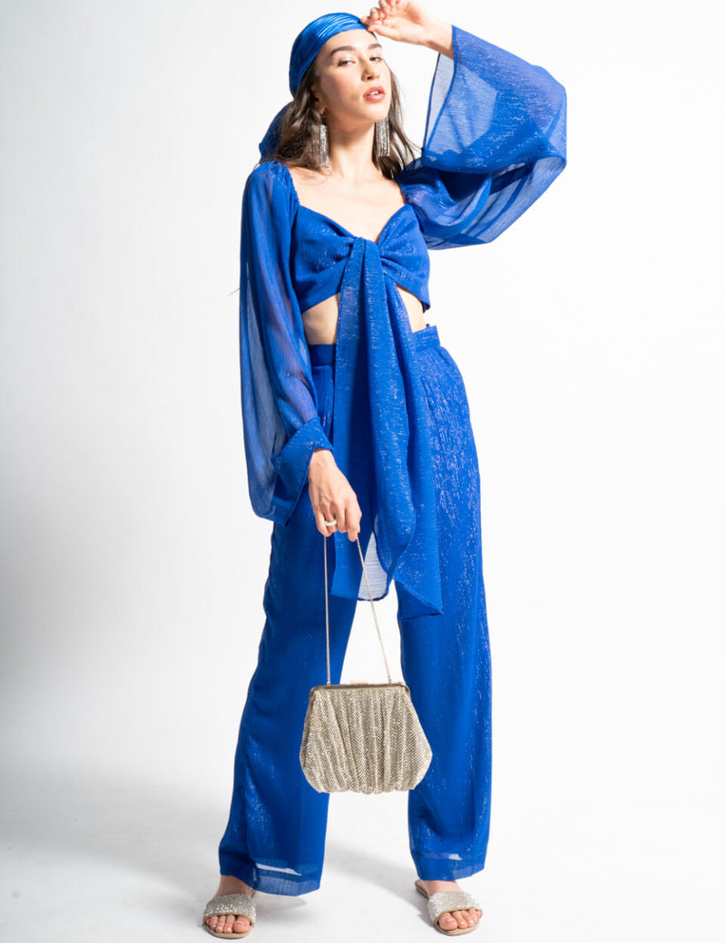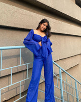 Royal Blue Chiffon Starlet Co-ord Set – Wrap Tie-Up Crop Top & High-Waist Pants for Women