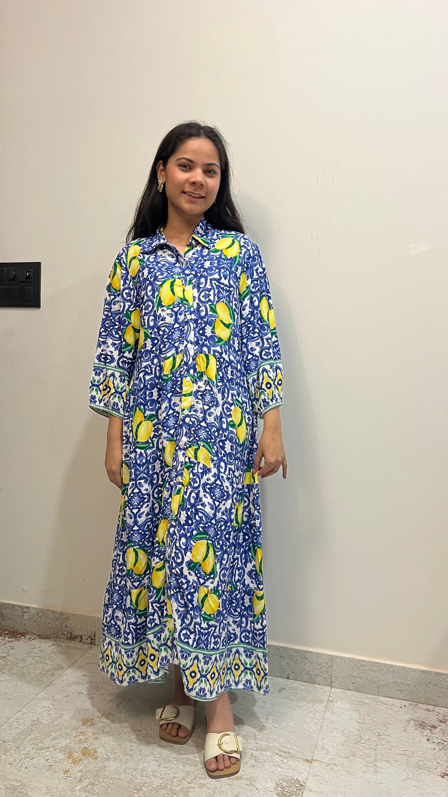 Blue Lemon Print Maxi Dress – Tiered Bodice Summer Outfit for Women
