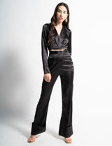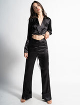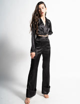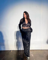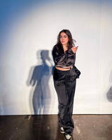 Black Satin Dawn Co-ord Set for Women – Cropped Satin Shirt & High-Waist Pants
