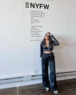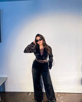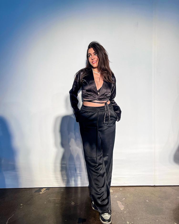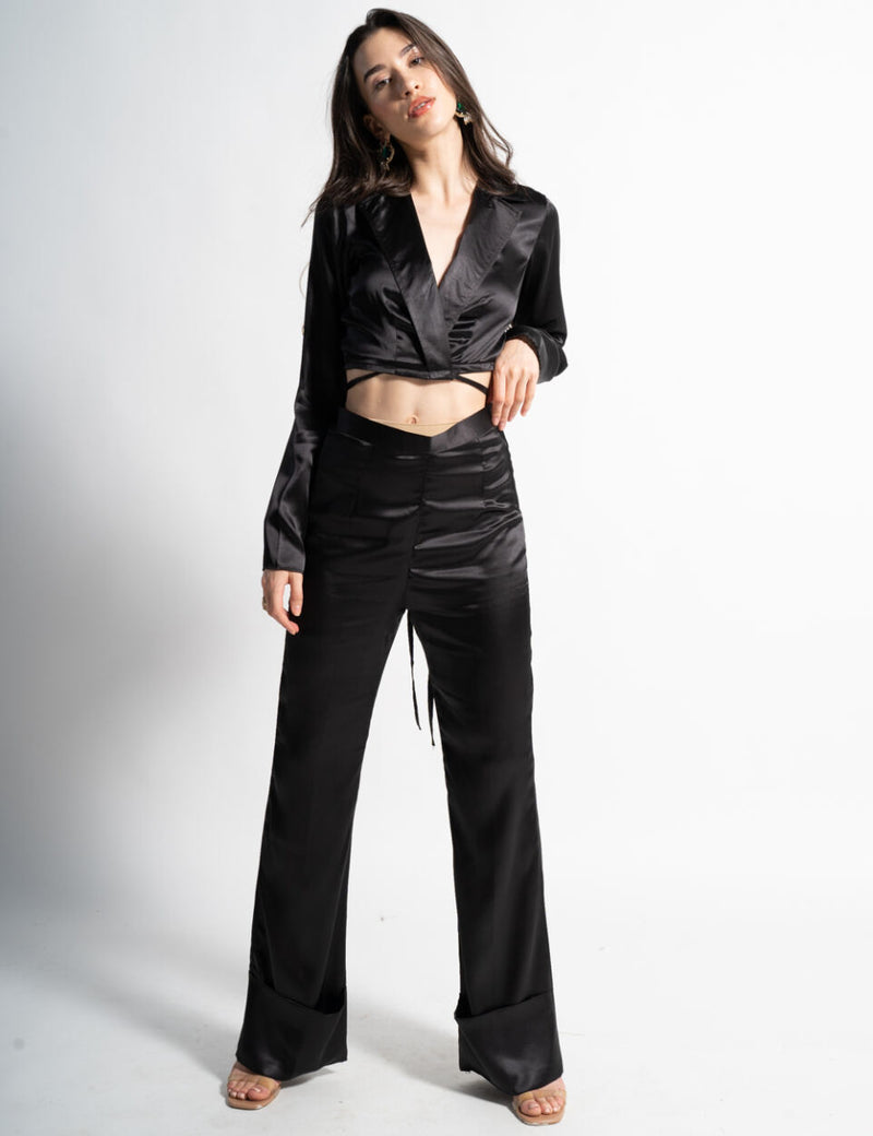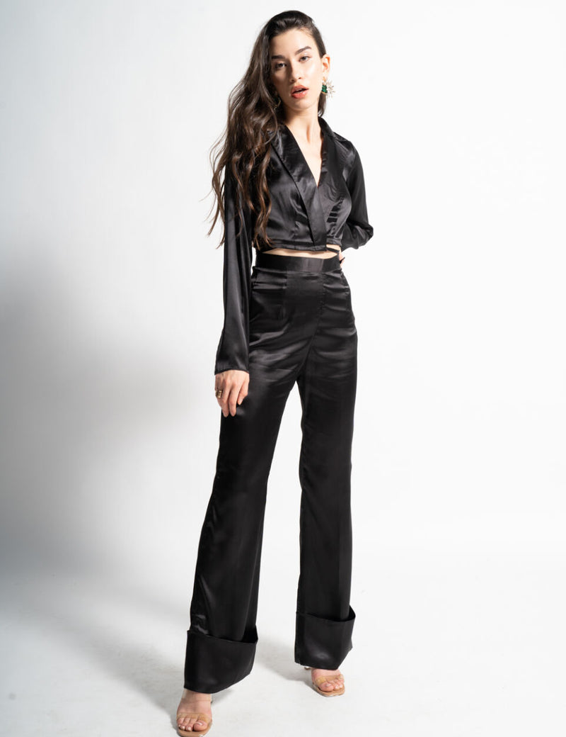 “This black satin set is made for women who want to stand out unapologetically. The glossy satin, cropped shirt, and high-rise pants make it a head-turner every single time.”