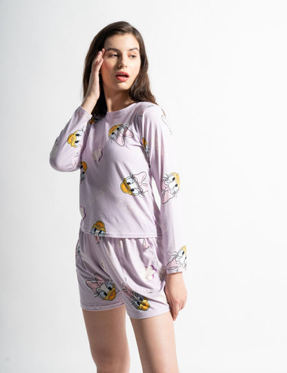 - Two-piece sleepwear set: long-sleeve top + shorts