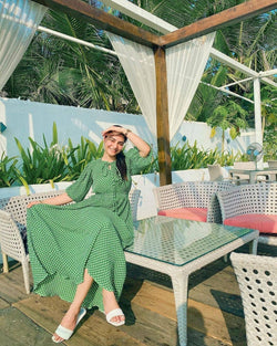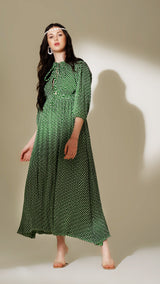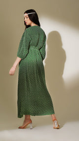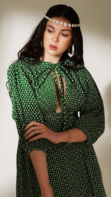 Diana Green Printed Maxi Dress – Satin Pleated Balloon Sleeve
