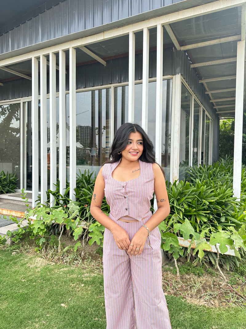 Keep it minimal, chic, and oh-so-effortless with our Striped Sleeveless Co-ord Set. Featuring a button-down crop top and high-waist wide-leg pants, this set is your go-to for brunches, vacations, or even smart casual evenings. Crafted in breathable fabric with a flattering silhouette, it’s easy on the skin and versatile enough to wear as separates. Whether paired with sandals for a day look or heels for a night vibe, this outfit brings comfort and confidence together.