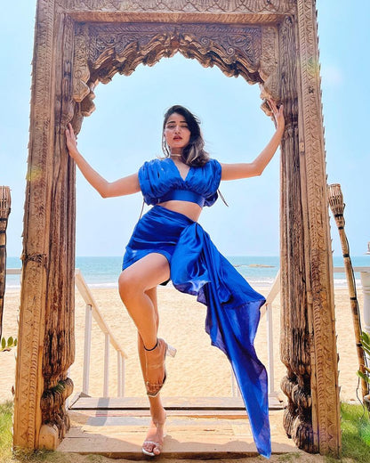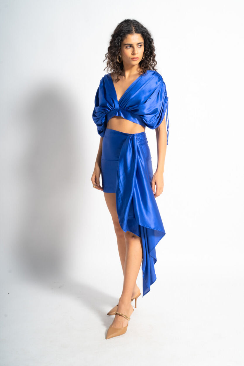 Blue Satin Sapphire Co-ord Set for Women – Drape Top & Skirt with Dramatic Drape