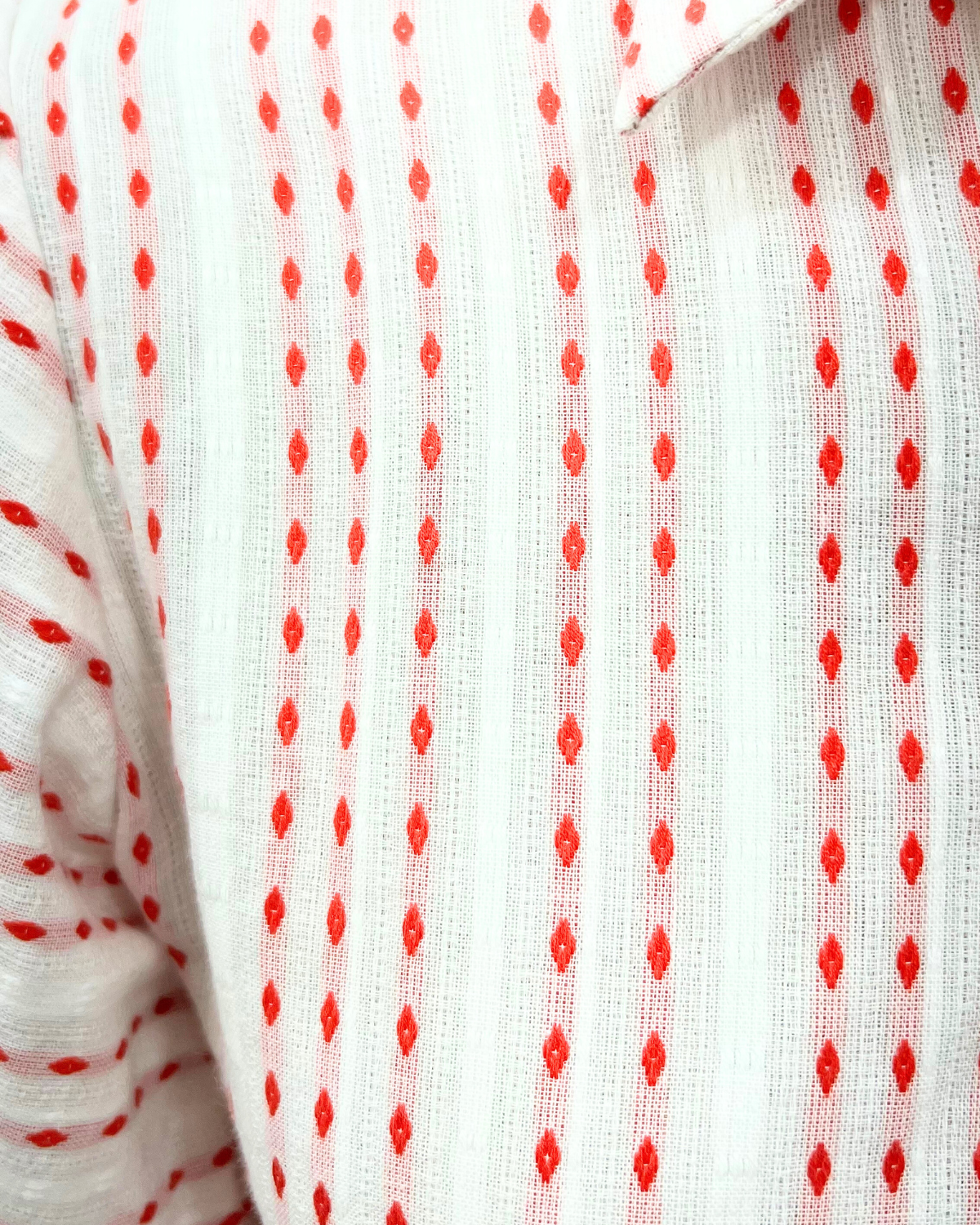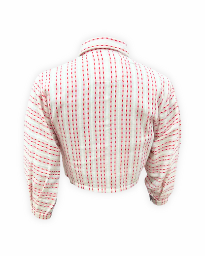A cropped shirt that’s equal parts fun and polished. With classic stripes, antique gold buttons, and puffed sleeves, this piece is a closet staple reimagined with playful energy. The cropped cut makes it versatile enough to style for work, play, or weekend hangouts.