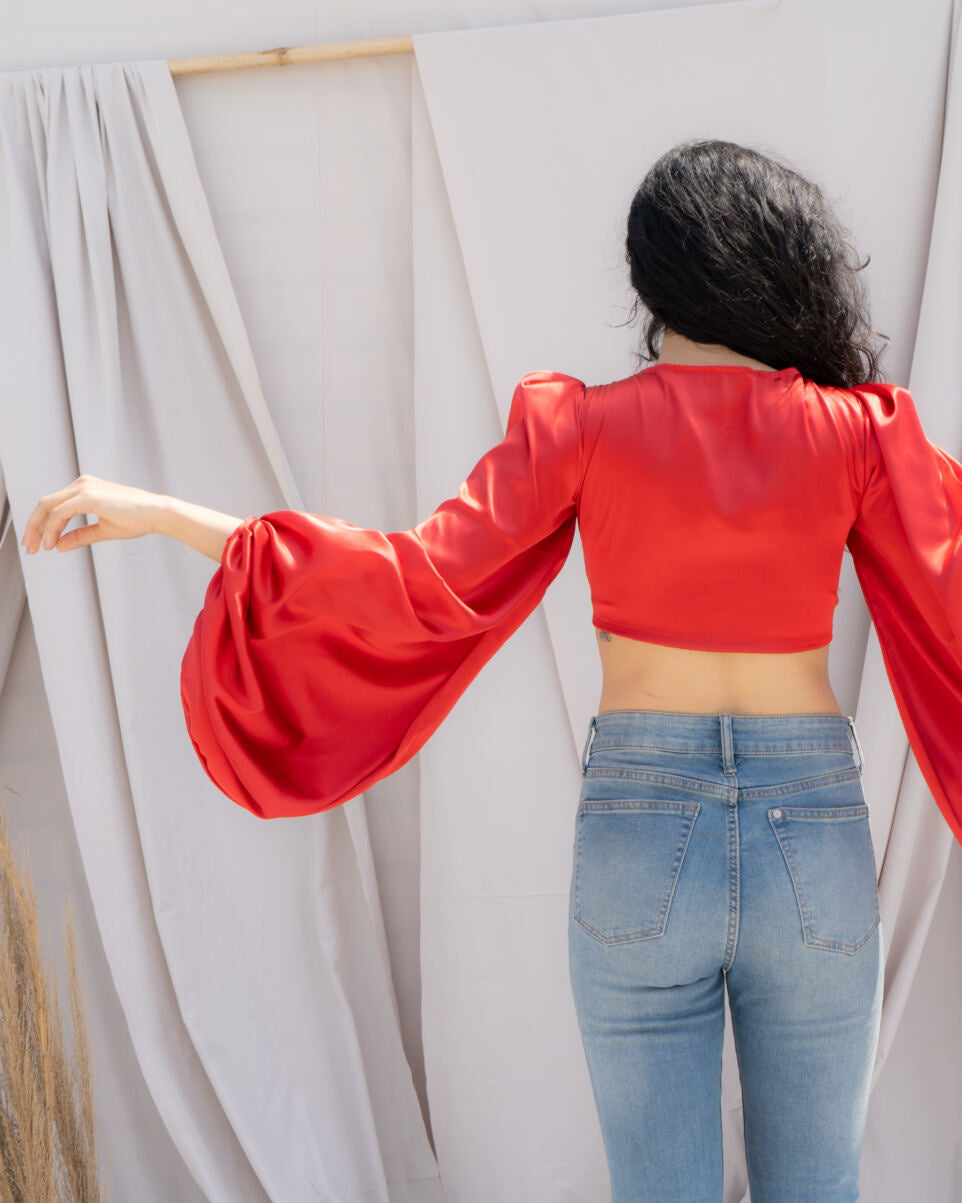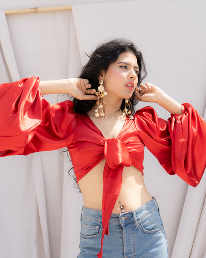 Red Satin Puff Sleeve Tie-Up Top | Dramatic Bow Crop Top