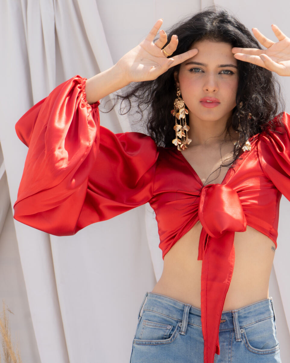 Meet your new wardrobe multitasker — the Red Satin Wrap Crop Top. Designed with a glossy satin-style finish, dramatic sleeves, and a tie-up wrap front, this top transitions seamlessly from Indian festive outfits to Western party looks. Whether paired with lehengas, sarees, or high-waist jeans, it’s the statement piece you’ll wear again and again.