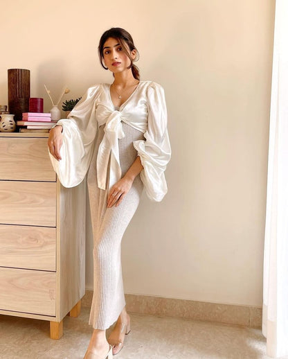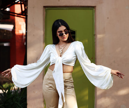 Meet your new wardrobe multitasker — the White Satin Wrap Crop Top. Designed with a glossy satin-style finish, dramatic sleeves, and a tie-up wrap front, this top transitions seamlessly from Indian festive outfits to Western party looks. Whether paired with lehengas, sarees, or high-waist jeans, it’s the statement piece you’ll wear again and again.