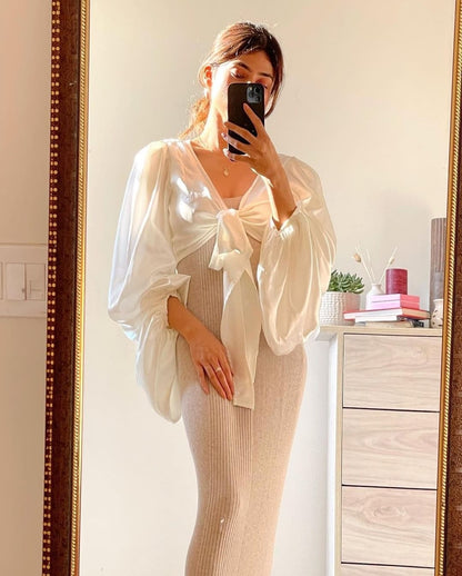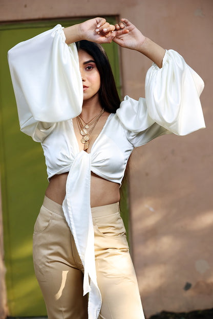 White Satin Puff Sleeve Tie-Up Top | Dramatic Bow Crop Top
