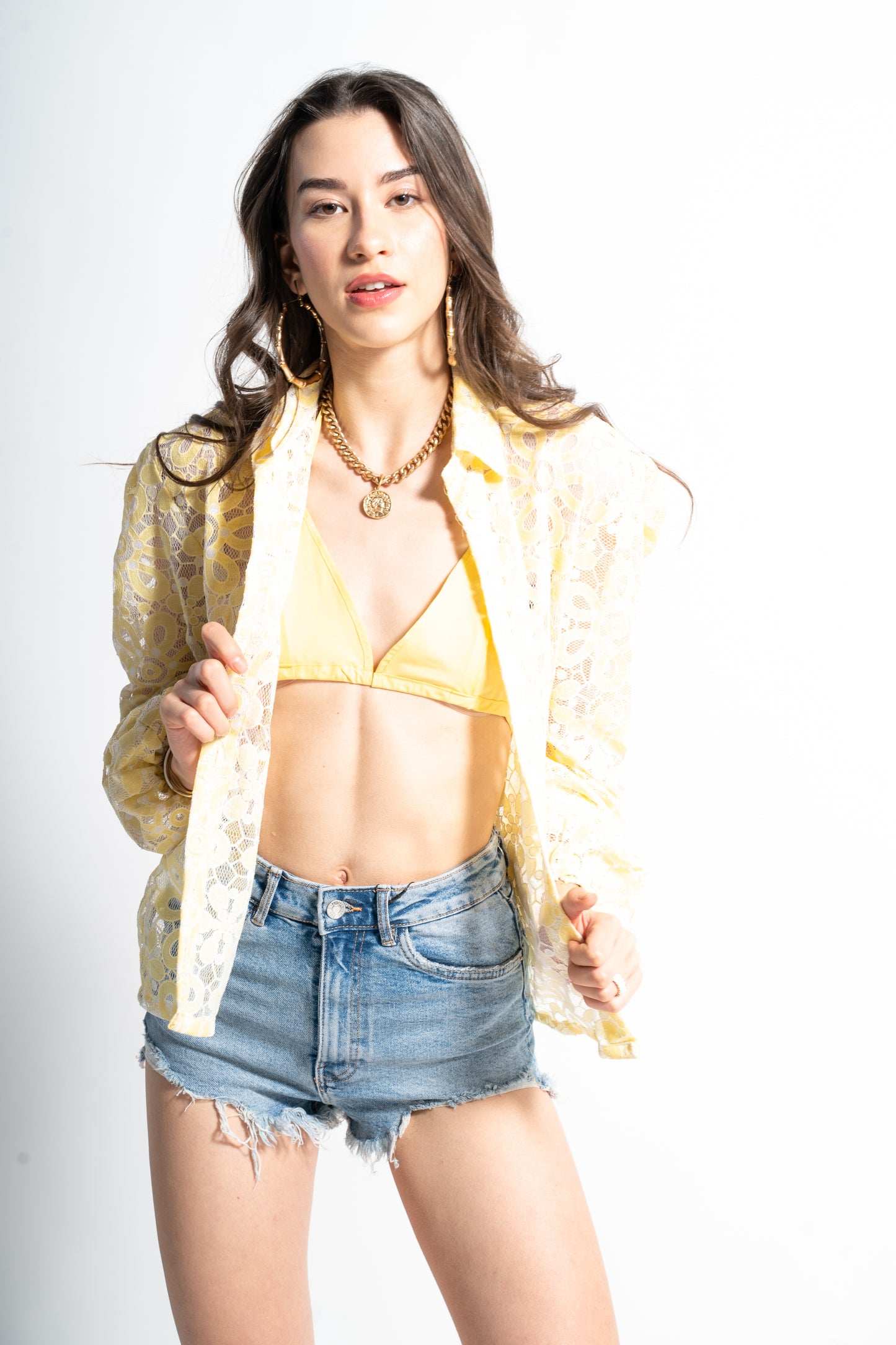 Your new power move in fashion: this yellow lace shirt blends delicate detailing with a daring edge. With its breezy resort collar, semi-sheer lace fabric, and relaxed fit, it’s made for days you want to turn casual into iconic. Wear it solo, layered over a bralette, or as a cover-up—you decide the vibe.